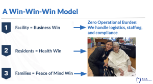 Zero Operational Burden: We manage all logistics, staffing, and compliance—allowing your team to focus on resident care while enhancing overall wellness outcomes.